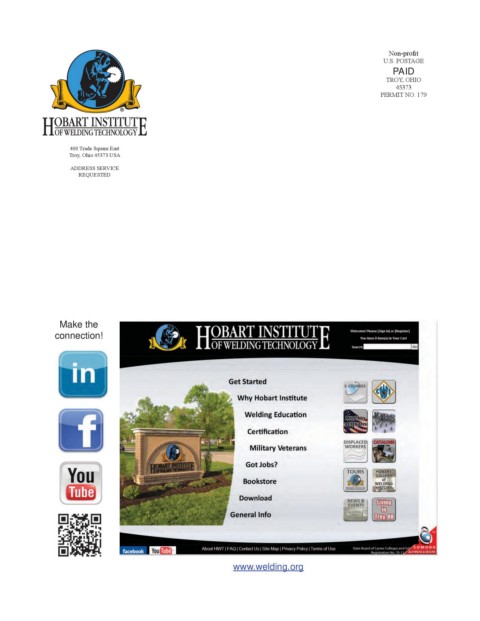 1RQ SUR¿W U.S. POSTAGE PAID TROY, OHIO 45373 PERMIT NO. 179 400 Trade Square East Troy, Ohio 45373 USA ADDRESS SERVICE REQUESTED Make the connection! www.welding.org